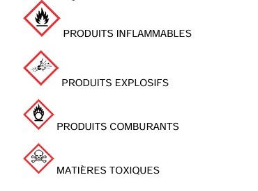 D’une manière générale, sont prohibées toutes les substances portant les symboles suivants et/ou faisant l’objet de conditions de stockage réglementées :